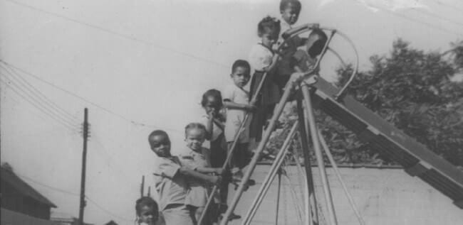 Kids seem to love going to the playground, no matter what year it is. This 1950s photograph shows a group of youngsters posing on a slide that was located at the Hering House playground. Hering House, located at 726 W. Western Avenue in South Bend, was a civic center donated to the African American community in 1925 by Clarabel and Frank Hering, who was the head football coach at the University of Notre Dame from 1896-98. Often referred to as the “House of Hope,” the Hering House served as a center for community activities until it closed in 1965. The invention of the slide is attributed to Charles Wicksteed, who installed the first one in 1922 in Wicksteed Park, located in Northamptonshire, England. This photograph is from the The History Museum’s photograph collection.