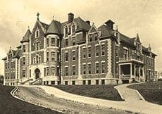 The Sisters of the Holy Cross operated a hospital on this site since 1882. To meet the needs of South Bend’s rapidly growing population, in 1903 the Sisters converted the building – originally a church – into the new St. Joseph’s Hospital. The French chateau-style structure had state-of-the-art medical technology. The elegant interior featured oak trim and Venetian tile fireplaces in many rooms. After years of service, the hospital closed in 1975 and was torn down four years later to make way for an expansion of the St. Joseph Regional Medical Center.