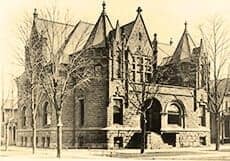 The first main library building constructed in South Bend opened its doors on May 8, 1896 at the southeast corner of Main and Wayne Streets. The striking red sandstone building with a copper-tile roof served the public for 62 years with over 70,000 volumes before closing its doors on June 6, 1958. The much larger and expanded St. Joseph County Public Library replaced the building in 1960 at the same location and still serves thousands of readers.