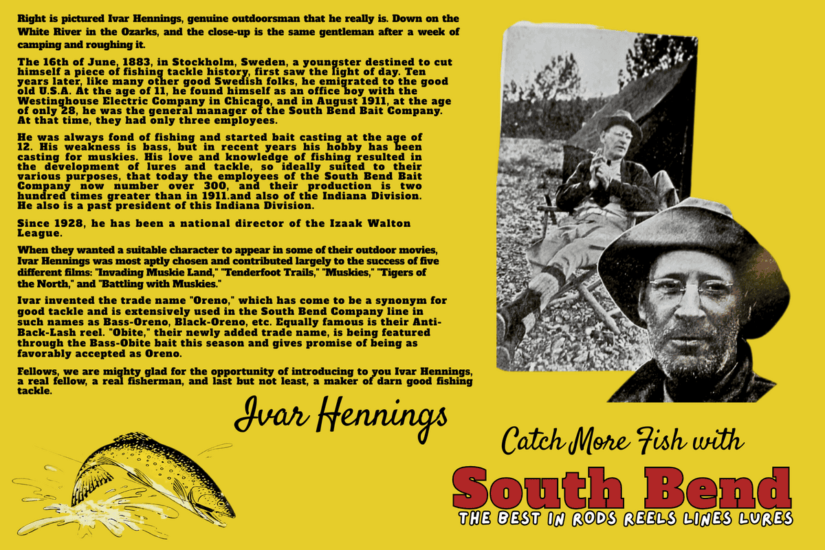 Ivar Hennings and an unidentified partner bought out the other owners in 1915 and in 1916 he acquired the right to a patent of James Olds of Benton Harbor, Michigan, for a lure which was to become the Bass-Oreno, the most popular lure made by South Bend Bait Company. The company soon employed about 50, mostly women, and made both wooden lures and the bucktail lures. The volume of bucktail lure production required keeping about 25,000 deer tails on hand. In 1917, South Bend Bait published its first catalog, “The Days of Reel Sport.”